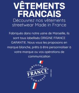 Vêtements ORIGINE FRANCE GARANTIE en marque blanche pour votre marque, vos clients ou opérations événementielles.